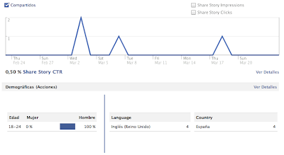 El botón Compartir también dispone de su propio apartado, en éste al igual que en el anterior Facebook nos facilita el número de veces que se ha clicado el botón así como el CTR e información demográfica varia.